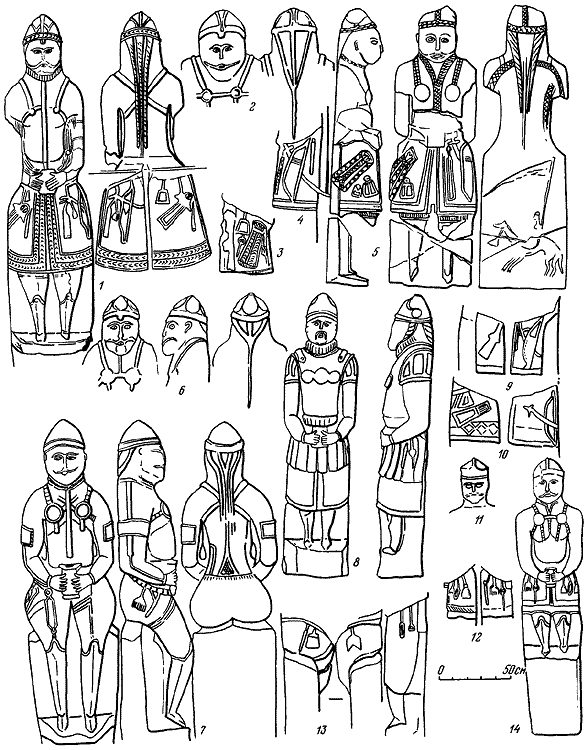 Рис. 88. Половецкие изваяния мужчин-воинов (1-14). Из запорожского, днепропетровского, херсонского, московского и краснодарского музеев. Стоящие статуи (1–5) снабжены полным набором характерного для кочевников оружия: луком с налучем и саблей (слева), колчаном со стрелами (справа). Защитный доспех у стоящих статуй тот же, что и у сидящих. Составила С.А. Плетнева.