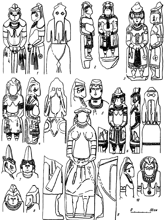 1–8, 10 – из днепропетровского и московского музеев; 9 – статуя половецкой амазонки с набором наступательного оружия, но в «шляпе» и с гривнами, как у обычной женщины. Из николаевского музея. Составила С.А. Плетнева.