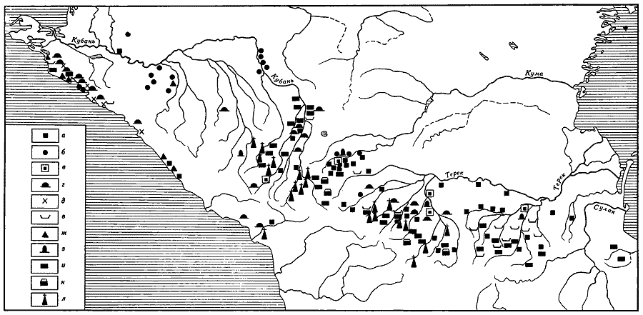 Рис. 91. Археологические памятники Северного Кавказа X–XIII вв.