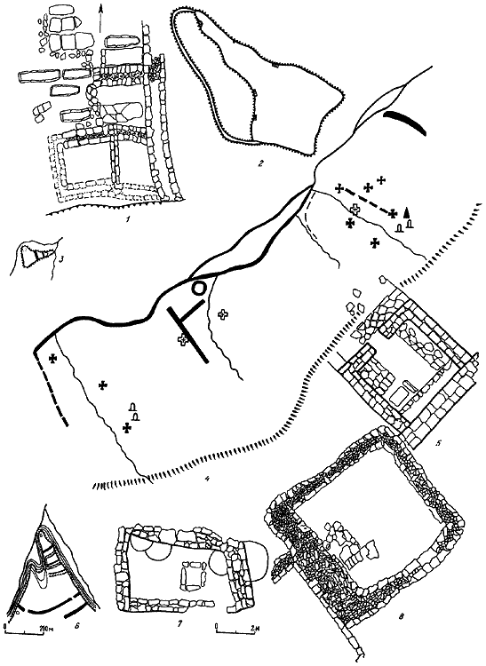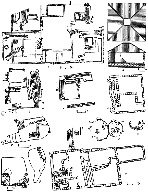 1 – многокомнатное здание; 2, 3 – квадратные дома; 4, 5, 6 – дома на сырцовом цоколе; 7–9 – полуземлянки с печами; 10, 11 – остатки юрт. Составили Г.А. Федоров-Давыдов и С.А. Плетнева.