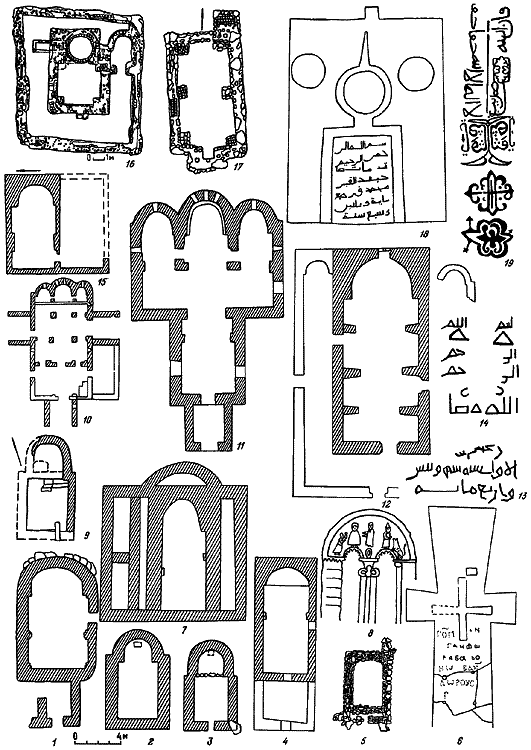 Рис. 93. Планы культовых сооружений и эпиграфические памятники X–XIV вв.