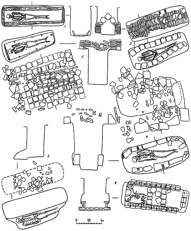 1–5 – погребения людей; 6 – кенотаф с захоронением барана. Составили Г.А. Федоров-Давыдов и С.А. Плетнева.