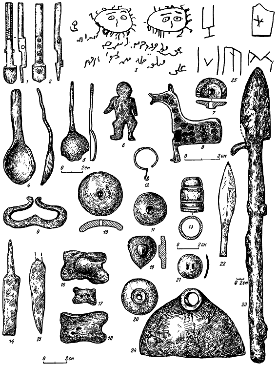 1, 2 – детали костяных щипчиков; 3 – рисунок и надпись на кости; 4, 5 – бронзовые ложечки; 6 – амулет; 7 – костяная пуговица; 8 – замок; 9 – кресало; 10, 11 – пряслица; 12 – серьга; 13 – костяное навершие; 14, 15 – ножи; 16–18 – альчики; 19–21 – бронзовые пуговицы; 22 – костяной наконечник стрелы; 23 – копье; 24 – мотыга; 25 – знаки на стенках и ручках сосудов. Составили Г.А. Федоров-Давыдов и С.А. Плетнева.