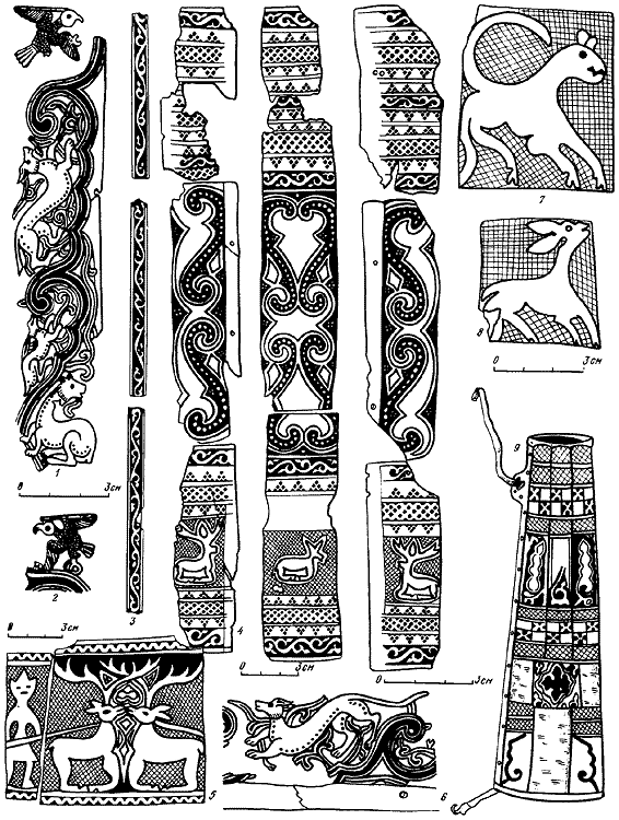 Рис. 99. Костяные накладки на колчаны из поволжских погребений кочевников золотоордынского времени (XIII–XIV вв.) (1–9). Составили Г.А. Федоров-Давыдов и С.А. Плетнева.