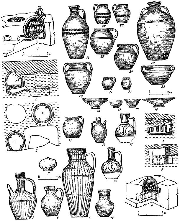 Рис. 101. Гончарные печи и массовая керамика золотоордынских городов.