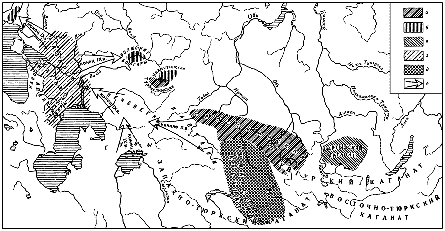 а, б – культура народов, не образовавших еще государственных объединений; в, г, д – государственные культуры; е – передвижения народов; ж – народы и государства, археологические памятники которых исследованы еще недостаточно. Составила С.А. Плетнева.