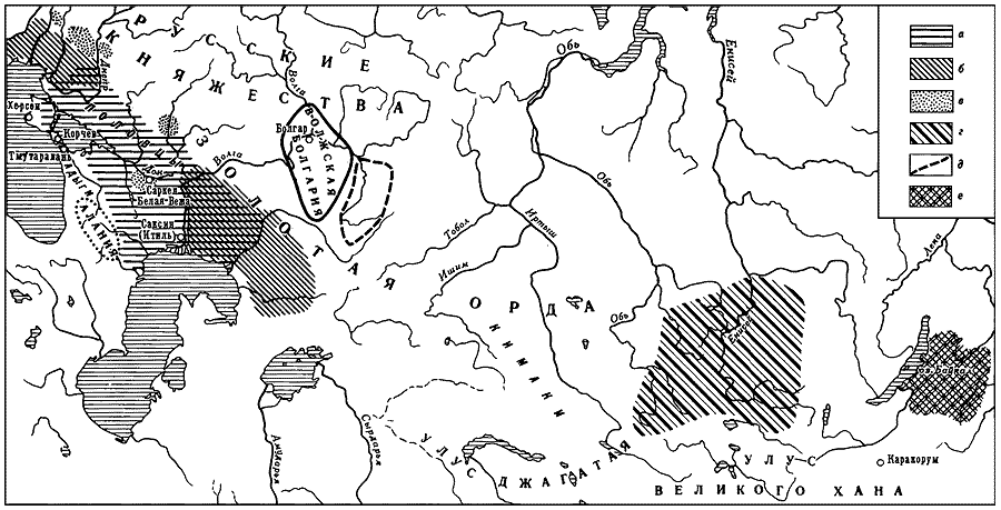 а – золотоордынские города; б – крупные золотоордынские города, чеканившие монеты; в – русские города, у которых произошли крупные сражения; г – граница Золотой Орды с Русью и Венгрией; д – поход 1223 г.; е – походы Бату и Менгу 1238–1240 гг.