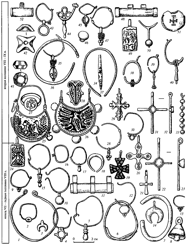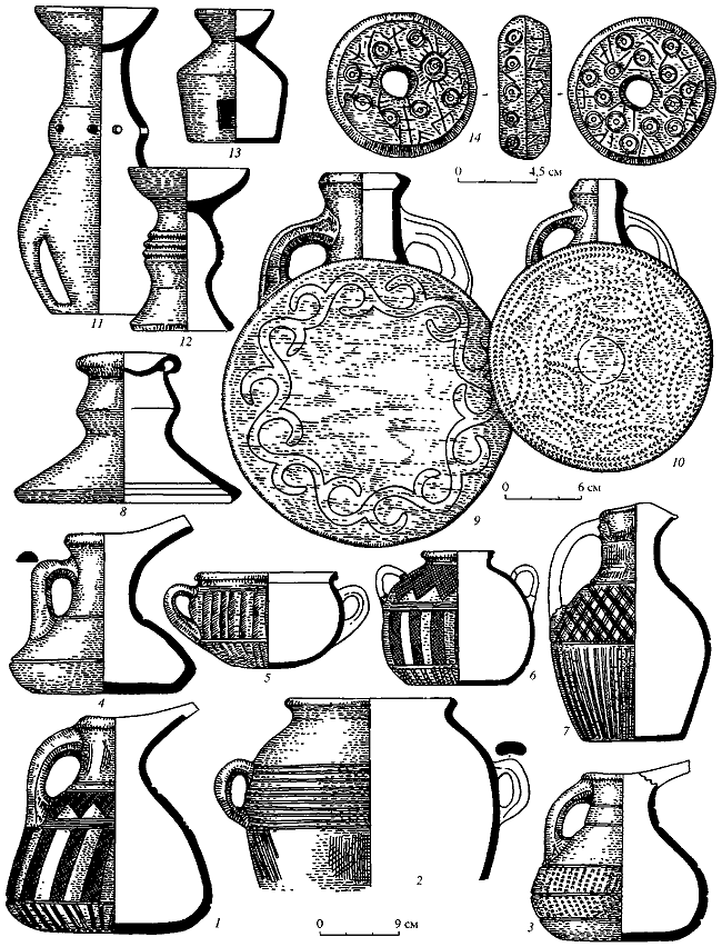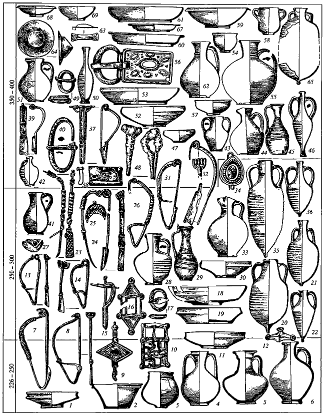 1–3, 5, 19, 24–28, 33, 40–42, 44–46, 51, 54 – глина; 47 – глина, красный лак; 4, 6–8, 13–15, 17, 20–23, 34, 35, 37, 43, 48 – железо; 9-12, 29–32, 52, 53, 58, 59 – стекло; 16 – костяные обкладки лука и его реконструкция; 18, 39, 49, 56 – кость; 36, 38, 50, 55, 57 – дерево.
