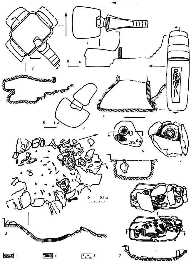 1 – Инкерман, склеп 25; 2 – Боспор, склеп 1603; 3 – Заморское, склеп 4; 4 – Боспор, склеп 1501; 5 – Черная речка, могила 21; 6 – Харакс, могила 35; 7 – Чатыр-Даг, могила 1; 8 – Харакс, могила 34.