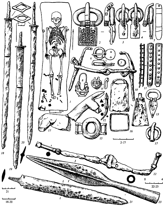 2–6 – пряжки; 9 – серебряный щиток пряжки; 7 – бронзовое колечко; 8 – серьга; 10 – железные удила; 11 – серебряные, плакированные золотом наконечники поясных ремней; 12 – железный наконечник стрелы; 13, 17 — серебряные пряжки; 14 – золотая обкладка статуэтки лошади; 15 – серебряная соединительная сбруйная бляха; 16 – железное ботало; 18–20 – мечи из аланских склепов Лучистое, склеп 88; 21, 22 – кинжал и железный псалий удил из склепа 88; 23 – копье из склепа 52.