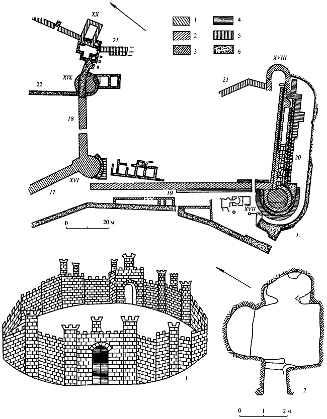 Условные обозначения; 17–21 – номера куртин; XVI–XX – номера башен; 1–3 – кладки античного времени и позднеримские кладки I–III вв.; 4 – кладки конца IV–V вв.; 5 – кладки VI в.; 6 – кладки IX–X вв.