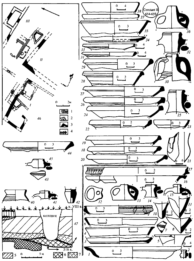 1-17 – керамика из слоя конца IV – последней четверти VI в; 18–39 – керамика из слоя последней четверти VI – третьей четверти VII в.; 40–45 – керамика из слоя пожара последней четверти VII в.; 46 – план построек, открытых на раскопе; 47 – стратиграфия слоев на раскопанном участке.