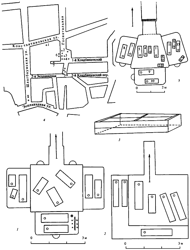 1 – план склепа 165; 2 – план склепа 180; 3 – рисунок гроба; 4 – план расположения некоторых склепов могильника на Госпитальной улице (1 – склеп в имении Гордиковых; 2 – склепы 154, 152, «два склепа 24 июня 1904 г.»; 3 – склепы 146–149; 4 – склеп 145, два склепа 1891 г.; 5 – склепы 163, 165, 167–169, 175–176; 6 – христианская катакомба 491 и вторая христианская катакомба; 7 – склепы 6, 12; 8 – склеп 180); 5 – план склепа 78.