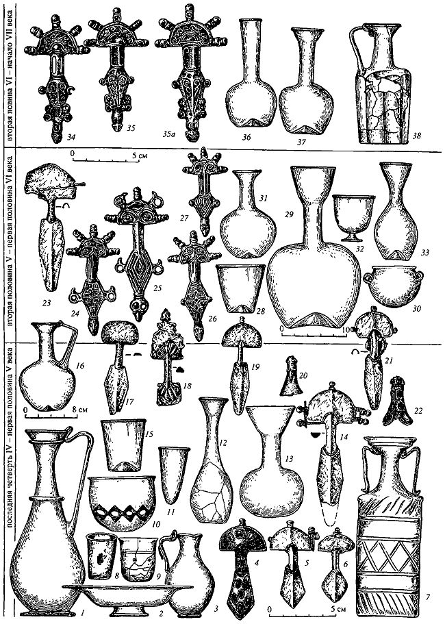 1–3, 7-13, 15, 16, 28–33, 36–38 – стекло; 4 – серебро, золото, гранаты; 5, 6, 14, 17–21, 23–27, 34, 35, 35а – серебро; 22 – серебро, золото, янтарь.