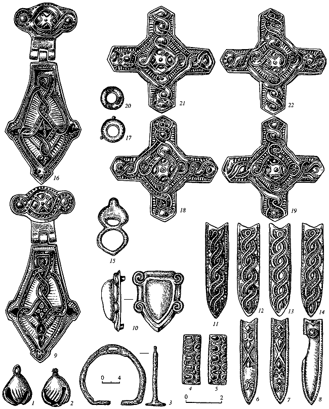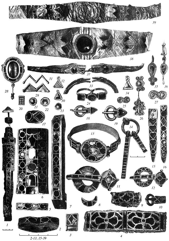 1, 2, 4–9 – меч и декоративные детали мечей и кинжалов; 3, 15, 16 – наконечники ремня; 10–12, 18, 19 – пряжки; 13, 33 – браслеты; 14 – часть конских удил; 17 – пронизка-бусина; 20–23, 25–27, 29–32, 34 – нашивные бляшки; 24 – перстень; 28 – кулон; 35, 36 – серьги; 37 – гривна; 38, 39 – венцы-диадемы.