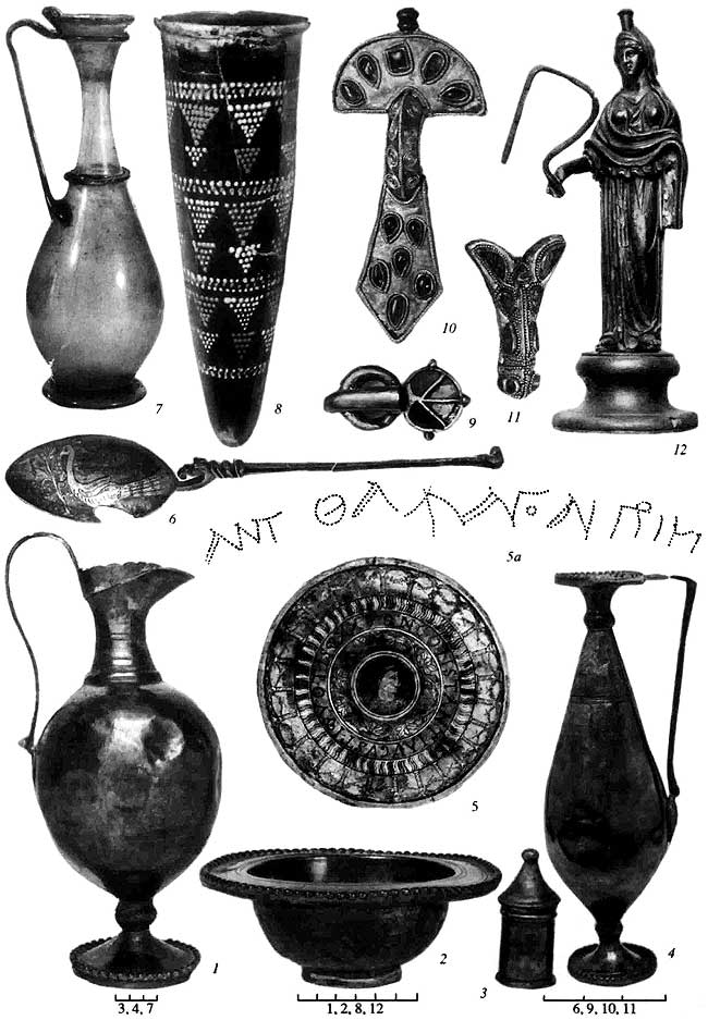 1–4, 6 – два кувшина, тазик, пиксида и ложка – серебряные изделия византийских мастеров; 5, 5а – серебряная юбилейная чаша с портретом императора Констанция II и греческой надписью на оборотной стороне; 7 – стеклянный кувшин; 8 – кубок-лампада из синего стекла с орнаментом из разноцветных стеклянных капель; 9 – золотая пряжка со вставками красного стекла; 10 – фибула, серебро, золото, гранаты; 11 – фибула-муха, серебро, золото, янтарь, 12 – бронзовая скульптура.
