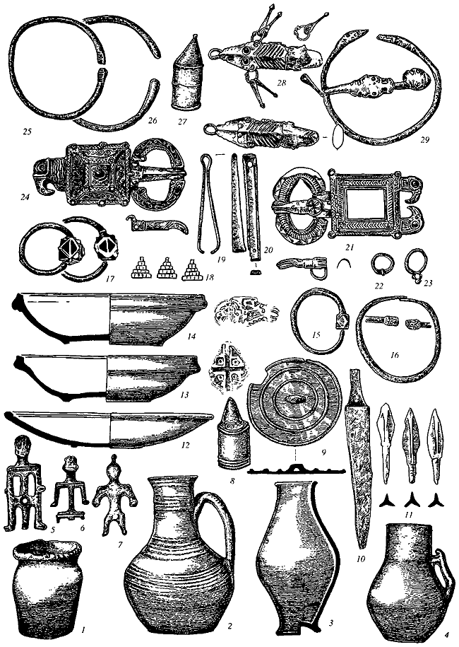 1–4, 12–14 – глина; 5–7, 9, 15, 16, 19, 21 – бронза; 8, 20, 24–29 – серебро; 10, 11 – железо; 17 – золото, стекло; 18, 22, 23 – золото.