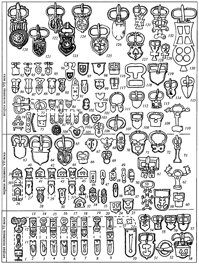 Таблица 37. Пряжки, детали поясных наборов и застежки из погребений конца VII–IX вв. Составлена А.И. Айбабиным.
