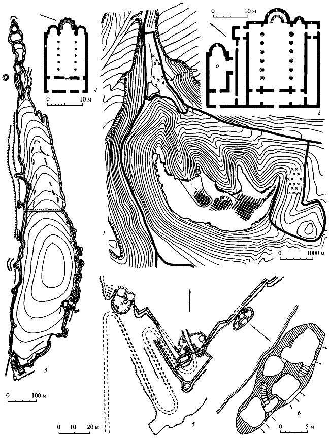 1 – округа плато Мангуп: I – оборонительная стена в балке Каралез; II – малая (ранняя) базилика; III – могильник VI-X вв.; IV – могильник V–X вв. в балке Албалык; V – Большая базилика на плато. Штриховкой обозначена обжитая территория VI–VIII вв.; 2 – Большая базилика Мангупа; 3 – Крепость Эски-Кермен; 4 – базилика Эски-Кермена; 5 – схема-реконструкция южного участка обороны крепости.