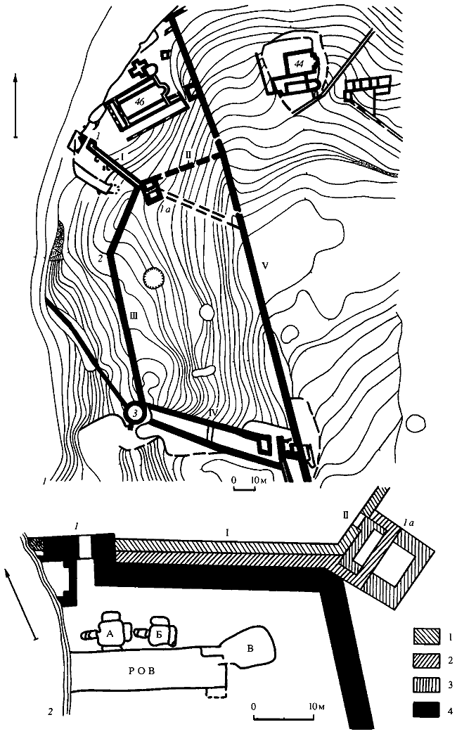 I–V – номера куртин; 1, 1а, 2, 3 – номера башен; 44 – базилика на холме; 46 – Западная базилика. Номера базилик соответствуют номерам на общем плане Херсона – см. рис. 3.