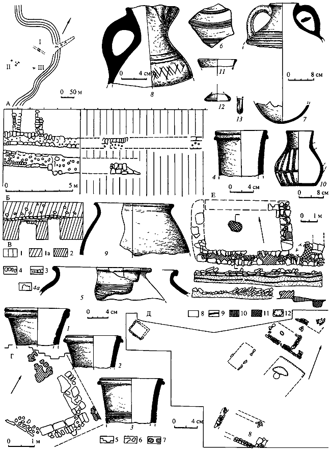 А – гавань Боспора с древним молом: I – стены хазарской крепости; II – дома и хозяйственные помещения; III – фундаменты постройки под церковью Иоанна Предтечи; Б – план открытых в раскопе фундаментов стен хазарской крепости; В – западный профиль раскопа; Г – угол хазарского здания, перекрытого церковью Иоанна Предтечи; Д – план расположения домов и хозяйственных построек; Е – дом № 12: план, фасировки южной стены, разрез очага.