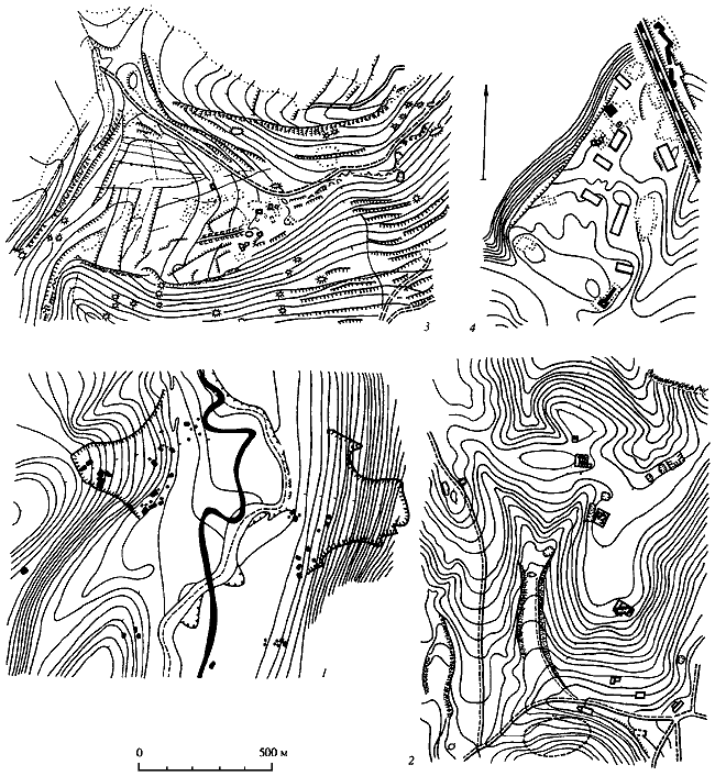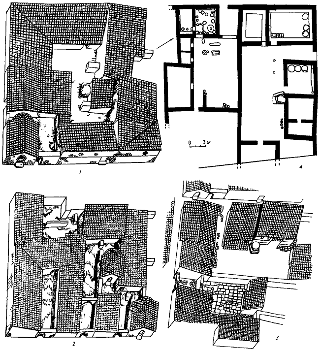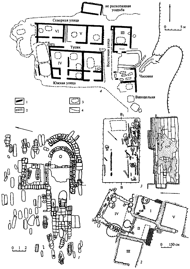 1 – план крестообразного и одноапсидного храмов XI–XIII вв. у подножия Баклы (по: Рудаков В.Е., 1984, рис. 1); 2 – план жилых домов XI–XIII вв. на посаде городища Бакла (по: Рудаков В.Е., 1975, рис. 1); 3 – гробница конца IX–X вв. у подножия Баклы (по: Баранов И.А., 1990, рис. 49); 4 – жилые усадьбы XI–XIII вв. на северном участке городища Эски-Кермен (по: Веймарн Е.В., 1958, рис. 1).