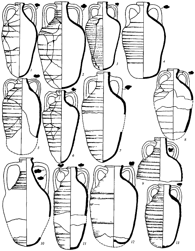 Тип амфор по типологии И.А. Баранова: 1, 8 – тип 1; 2 – тип 2; 3 – тип 3; 5 – тип 4; 6, 7 – тип 5; 9 – тип 6; 11 – тип 7; 12 – тип 8; 13 – тип 9; 4 – северопричерноморская 2-го варианта; 10 – тип Кесария 5 (по: Adan-Bayewitz D., 1986. Fig. III, 103, 2, 4).