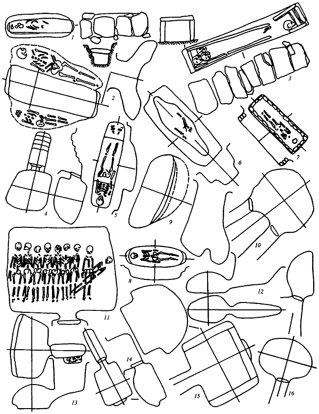 1 – средневековый некрополь на плато Бакла, могила 6/1994; Эски-Кермен: 2 – могила 303; 6 – могила 196; 8 – могила 282; 9 – могила 340; 11 – склеп 153; 12 – склеп 181; 13 – склеп 189; 3 – Кордон-Оба, могила 53; 4 – Мангуп, усыпальница 1/1938; 5 – Лучистое, могила 68; Узень-Баш, 1926 г.: 10 – склеп 2; 16 – склеп 1; Скалистое: 7 – могила 293; 14 – склеп 552, 15 – склеп 214.