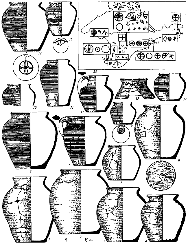1–3, 5-16 – Тау-Кипчак; 4 – Кордон-Оба; 17 – Мирмекий; 18 – Тиритака; 19 — Тепсень; 20 – Кордон-Оба; 21 – Тау-Кипчак; 22 – Трудолюбовка; 23 – Бакла; 24 – Гончарное; 25 – Херсонес; 26 – Поворотное; 27 – Чайка; 28 – Карта распространения клейм на днищах кухонных горшков в Крыму.