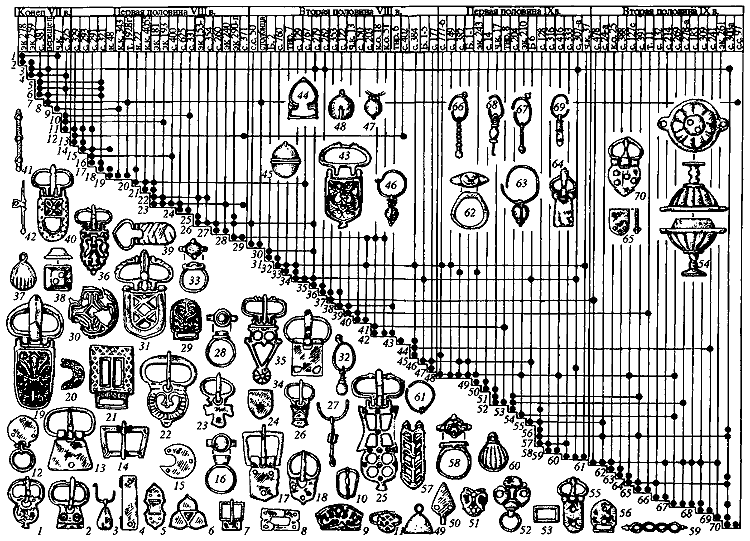 Таблица 39. Украшения из погребений конца VII–IX вв. Составлена А.И. Айбабиным.