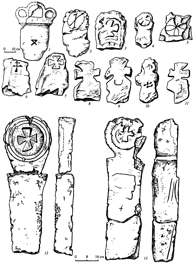 1 – крестовокупольный храм на акрополе конца XI–XIII вв.; 2 – крестовокупольный пятиапсидный храм конца XI–XIII вв.; 3 – Западный загородный крестообразный храм конца IX–X вв. и поздняя часовня; 4 – крестовокупольный шестистолпный храм № 34 конца XI–XIII вв.; 5 – однонефный храм XII–XIII вв. в Портовом районе; 6 – крестовокупольный четырехстолпный храм № 9 конца XI–XIII вв. и его реконструкция Ю.Г. Лосицкого; 7-10 – бронзовые кресты-энколпионы из помещения XII – первой половины XIII в.