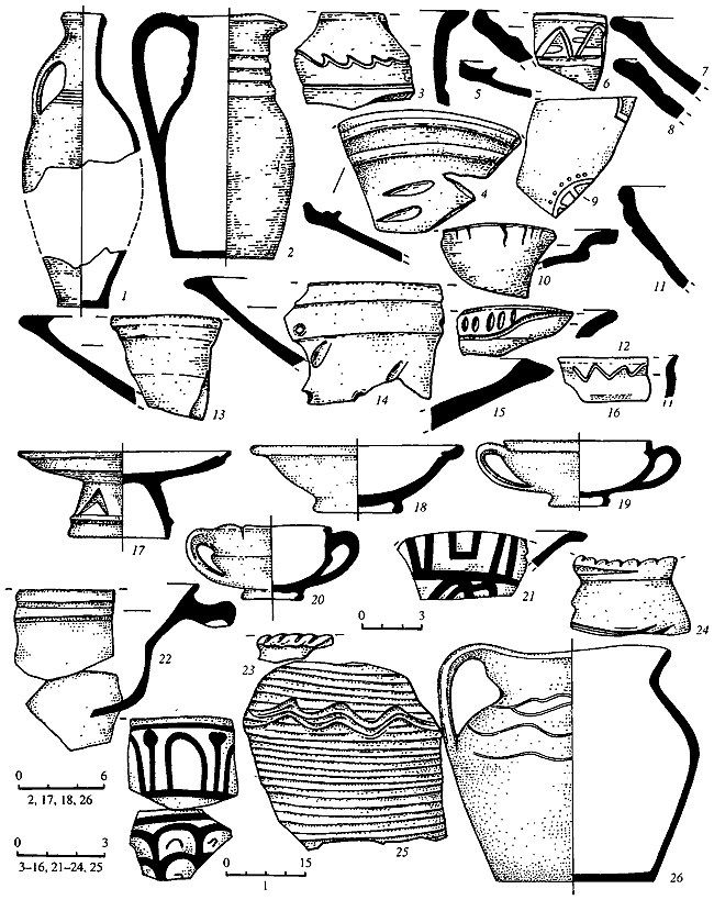 1, 3-22, 26 – керамика из слоя, накопившегося в период функционирования оборонительных стен второго периода; 2, 23–25 – керамика из засыпи цистерн.