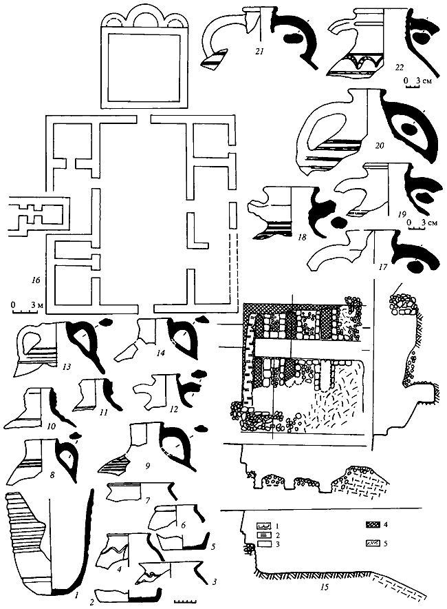 Гончарная печь IX в. в районе Радиогорки (15) и керамика из нее (1-14); здание администрации фермы (16); амфоры из комплекса первой половины IX в. (17–22).