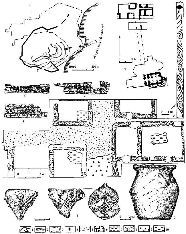 1 – красноглиняный сосуд – ритон с налепным и графическим орнаментом (помещение № 3); 2 – лепной кухонный горшок из печи в помещении № 1; 3 – вскрытая часть квартала Корчева с остатками пяти построек и улицами с мощением из крошки ракушечника и обломков красноглиняной керамики; 4–6 – фасировки стен корчевских домов; 7 – план Керчи (по А. Ашику); 8 – расположение раскопов с домами Корчева и древней части церкви Иоанна Предтечи; 9 – стеклянный браслет с росписью из погребения XI в.