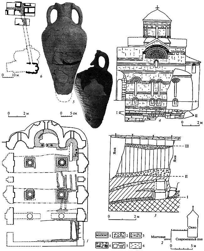 Раскопки около южной стены и в интерьере: 1 – раскопки в интерьере (точками заштрихованы вскрытые участки ленточного фундамента); 2 – взаимное расположение церкви и мостовой Корчева; 3 – профиль раскопа около южной стены церкви; 4 – южный фасад церкви с раскрытой раскопками нижней частью стены с фундаментом (нулевая линия соответствует уровню современной дневной поверхности); 5 – голосники из южной стены церкви; 6 – схема расположения церкви и квартала Корчева.