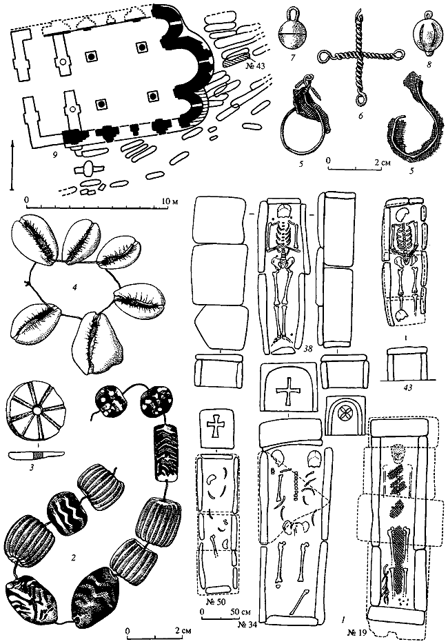 1 – погребения в каменных ящиках около церкви Иоанна Предтечи; 2–8 – инвентарь погребения № 43 около центральной апсиды церкви; 9 – взаимное расположение церкви и вскрытых погребений.