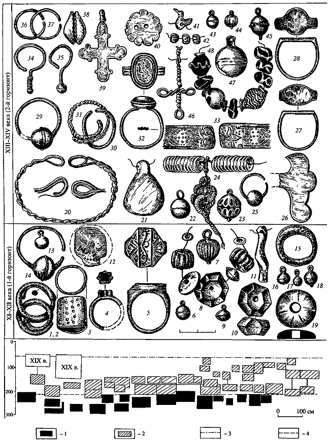 Условные обозначения: 1 – могилы I горизонта; 2 – могилы II горизонта; 3 – уровень ремонта XIV в.; 4 – уровень строительного мусора времени постройки церкви Иоанна Предтечи.