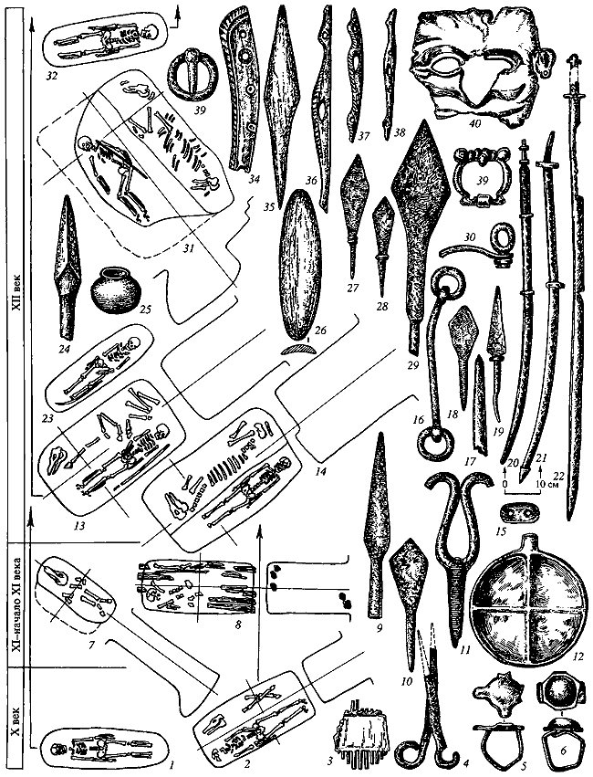 3 – дерево; 4, 9-11, 16, 18–22, 27–30, 35, 40 – железо; 5, 12, 39 – бронза; 6 – бронза, синее стекло; 15, 17, 24, 26, 34, 36–38 – кость.