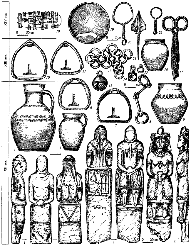 А. Вещи из прицерковного кладбища Корчева. 1–2 – серебро; 3–7 – бронза; 8 – стекло, перламутр, сердолик; 9 – бронза; 10 – сердолик; 11 – коралл; 12 – серебро; 13 – бронза; 14 – золото; 15 – железо; 16–18 – бронза; 19 – кость; 20 – серебро; 21 – лазурит; 22 – бронза; 23 – серебро; 24 – кожа, бронза; 25, 26 – серебро; 27, 28 – бронза; 29 – серебро; 30 – золото; 31 – серебро; 32 – золото; 33–35 – серебро; 36, 37 – золото; 38 – раковина каури; 39 – бронза; 40–42 – глина, полива; 43, 44 – бронза; 45–47 – серебро; 48 – стекло. Б. Стратиграфия прицерковного кладбища Корчева.