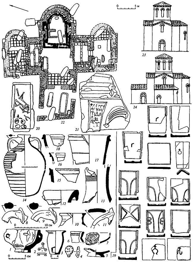 1–7 – керамика из раскопок часовни; 8-18 – керамика из раскопок Крестообразного храма; 19 – черепица; 20 – гробница 1; 21 – фрагмент плиты с надписью «…святого Феодота. Христа»; 22 – план храма и часовни; 23 – реконструкция южного фасада храма в первый строительный период; 24 – реконструкция южного фасада храма во второй строительный период (по Ю.Г. Лосицкому).