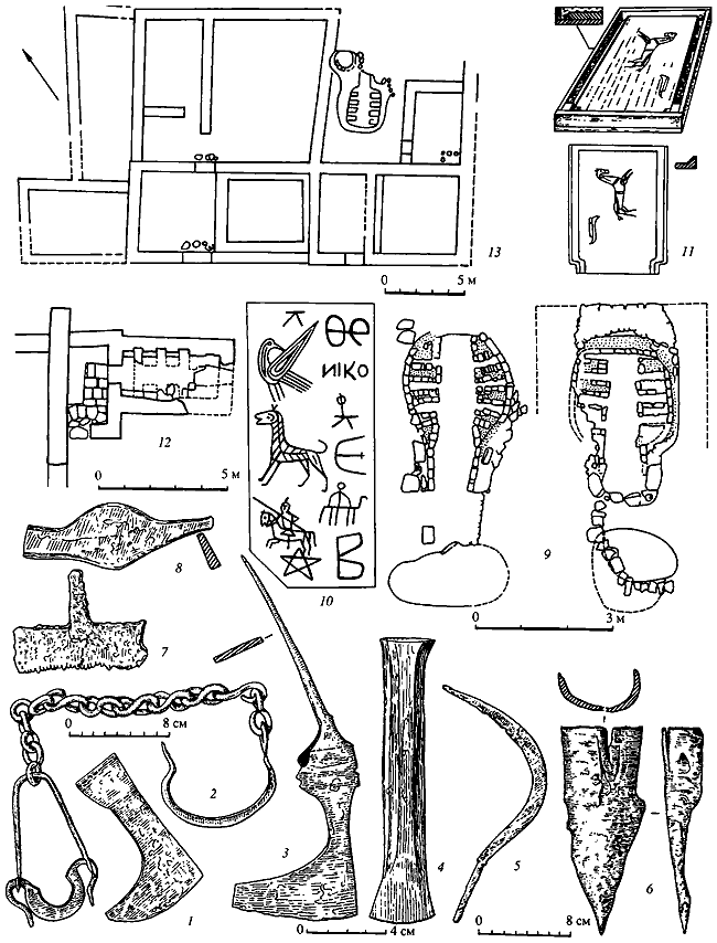 1–8 – железные орудия труда из помещений XII–XIII вв.; 9 – гончарные черепицеобжигательные печи из XVII квартала XII–XIII вв.; 10 – метки на черепице XII–XIII вв.; 11 – реконструкция формы для изготовления черепицы (по: Сидоренко В.А., 1985); 12 – баня во дворе жилого дома в Северном прибрежном районе; 13 – жилой дом XII – 70-х годов XIII в. в XX квартале (по: Калашник Ю.П., 1989).