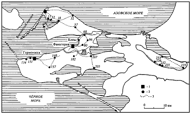 В ранневизантийский период (V–VII вв.) в рассматриваемом регионе насчитывается 26 поселений (рис. 8), включая Гермонассу, Фанагорию и Кепы, в то время, вероятно, уже не являвшиеся городами в том смысле, в каком они были ими в античный период. Помимо сокращения числа поселений, произошли также заметные изменения в их размещении. По месту расположения явно выделяются четыре группы поселений: 1) округа Гермонассы, находившаяся в юго-западной части полуострова и состоявшая из пяти поселений, включая саму Гермонассу; 2) округа Фанагории и Кеп – в центральной части полуострова, состоявшая из десяти поселений вместе с упомянутыми городами; 3) округа Ильичевского городища (1)[8]8