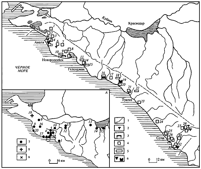 1 – Джигинское (Михаельсфельд), находки 1892–1893 гг.; 2 – Капустня, находки 1986 г.; 3 – Султановская гора, впускное погребение 1982 г.; 4 – Анапа, отдельные погребения и находки; 5 – «Андреевская щель», отдельные находки; 6 – Гай-Кодзор; 7 – «Ленинский путь», сборы разных лет; 8 – Борисовка, комплекс 31.12.1955; 9 – Цемдолина; 10 – Дюрсо; 11 – Южная Озерейка; 12 – Мысхако; 13 – Борисово; 14 – Геленджик, сборы и единичные погребения разных лет; 15 – Геленджик, «Толстый мыс»; 16 – Бжид; 17 – Тенгинка, «курган»; 18 – Сопино; 19 – Новомихайловский, городище «МТС»; 20 – Новомихайловский, Дузу-кале; 21 – Небугская, находки 1897 г., сборы и погребения 1983 г.; 22 – Агойский аул; 23 – Шепси; 24 – Верхнее Буу, погребение 1985 г.; 25 – Сочи, находки разных лет; 26 – совхоз «Приморский», погребение 1979 г.; 27 – находки 1913 г. в кургане бывшего г. Романовска; 28 – Красная поляна, погребение 1942 г., находки разных лет; 29 – Адлер и окрестности, находки разных лет; 30 – Ермоловка, находка браслета; 31 – Веселое, находки разных лет; 32 – Псоу.