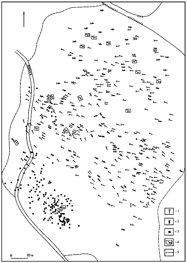 Условные обозначения: 1 – трупоположения; 2 – трупоположения, нарушенные в древности; 3 – трупосожжения; 4 – могилы коней; 5 – границы раскопанной площади.