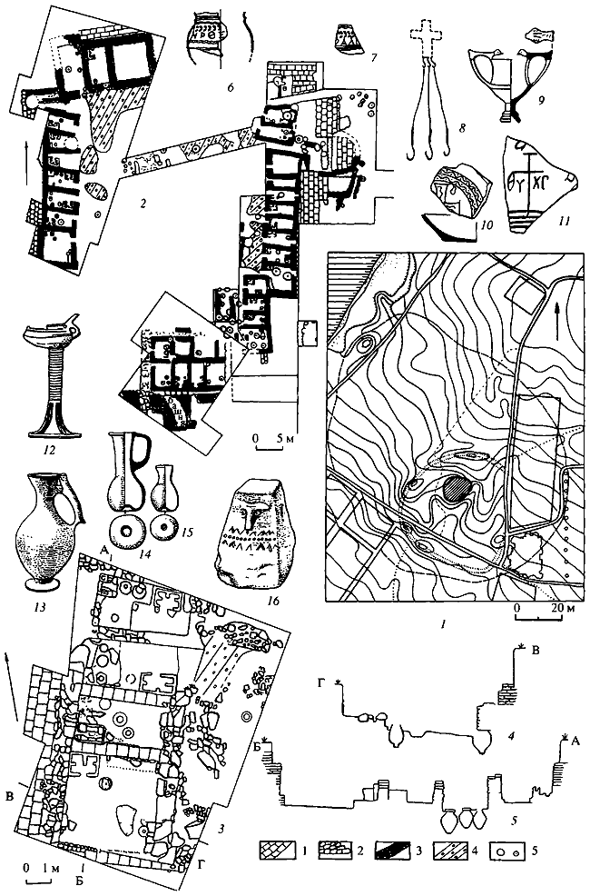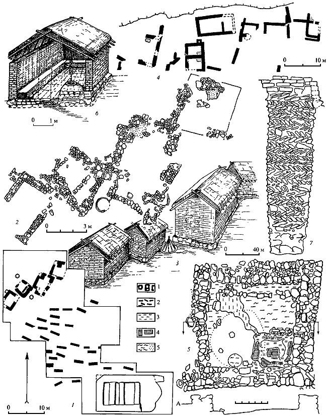 Условные обозначения: 1 – сырцовая кладка; 2 – каменная кладка; 3 – каменная кладка; 4 – каменно-черепяная вымостка; 5 – вкопанные в землю пифосы и амфоры.