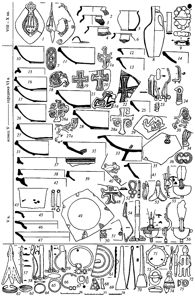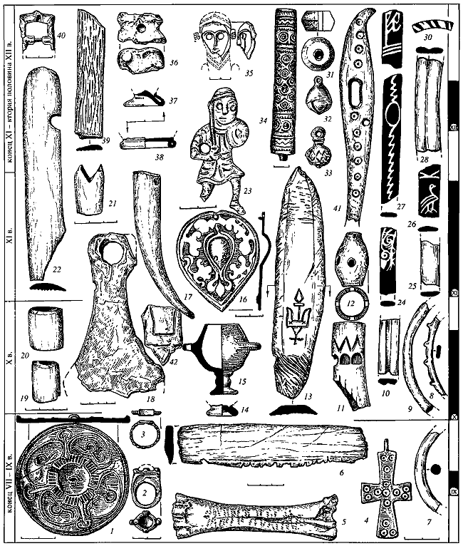 1 – бронзовое зеркало; 2, 3 – перстни; 5, 6 – костяные орудия труда для обработки кожи; 4 – бронзовый крест; 7-10 – обломки стеклянных браслетов; 11, 12 – костяные челноки для ткацких станков; 13 – роговая срединная накладка на лук; 14 – донце (ножка) стеклянного сосудика; 15 – бронзовый сосуд-реликварий; 16 – налобная или наносная бляха от оголовья конской узды; 17 – роговой наконечник; 18 – железная мотыга; 19–21 – костяные наконечники охотничьих стрел; 22 – костяная конечная накладка на лук; 23 – накладка из кости, изображающая воина с мечом и щитом; 24–30 – обломки стеклянных браслетов; 31 – шиферное пряслице; 32, 33 – бронзовые бубенчики; 34 – костяная рукоять от ножа; 35 – бронзовая личина; 36 – альчик; 37, 38 – донца стеклянных сосудиков; 39 – костяная накладка на лук; 40 – обломок бронзовой пряжки; 41 – костяная петля от колчана или налуча; 42 – знак Святослава на обломке амфоры.