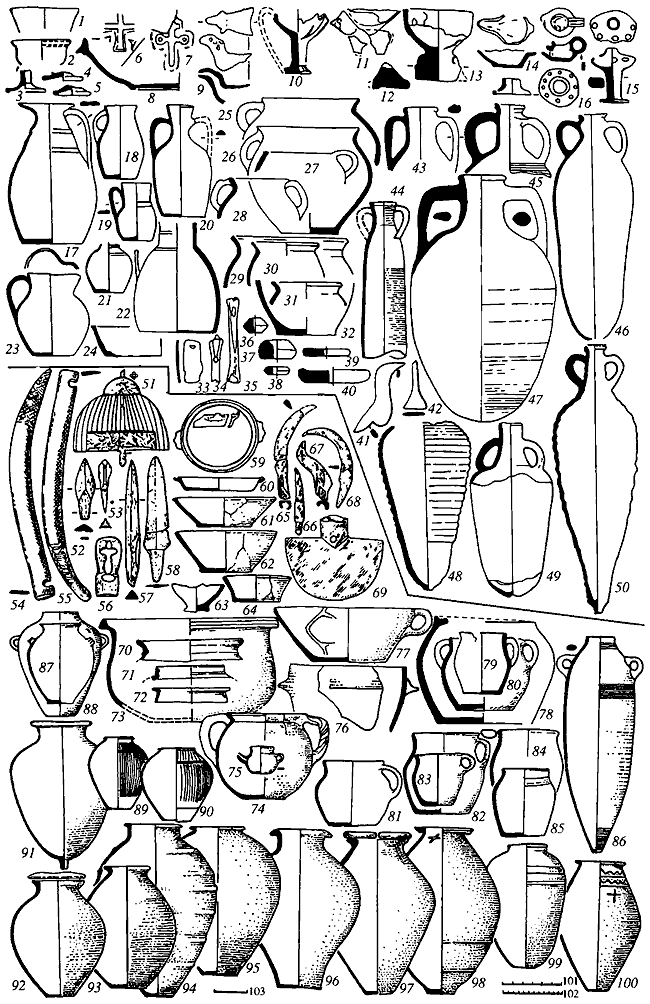 1–8 – сосуды; 9, 15 – привески; 10, 13, 16, 17 – бусы; 11, 14 – крестики; 12 – застежка; 18, 21–24 – бубенчики; 19 – височное кольцо; 20 – детали головного убора; 25 – пуговка; 26 – зеркало; 27 – шлем; 28–34, 36 – стрелы; 35 – шпилька; 37 – колчанная петля; 38 – накладка; 39 – сабля и навершие ее рукояти; 40 – принадлежность сбруи; 41–44, 46 – части сбруи; 45 – поясная пряжка; 47–49 – гравированные накладки на луки седла; 50, 51 – поясные пряжка и наконечник.