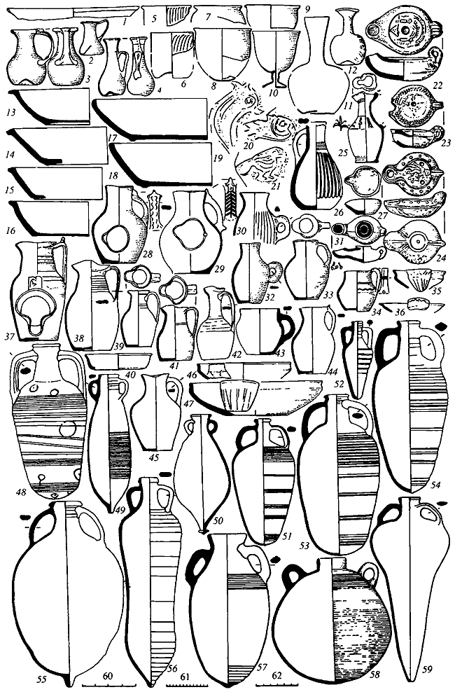 1-12 – образцы стеклянной посуды; 13–18 – образцы «понтийской» краснолаковой керамики; 19–21 – редкие формы клейм на краснолаковой керамике; 22, 25 – пом. XII; 23 – подъемный материал; 24, 30, 32, 34 – пом. XI; 26 – кв. XXXVII, шт. 3; 27, 31 – уч. А, 1978 г.; 29 – кв. XXVII; 30 – пом. I; 31 – пом. XXI, ниша; 35, 36, 46 – раскоп «Б», кв. II; 37–41 – пом. III; 42 – пом. XV; 44 – пом. II; 47 – пом. V; 48–59 – образцы амфор.