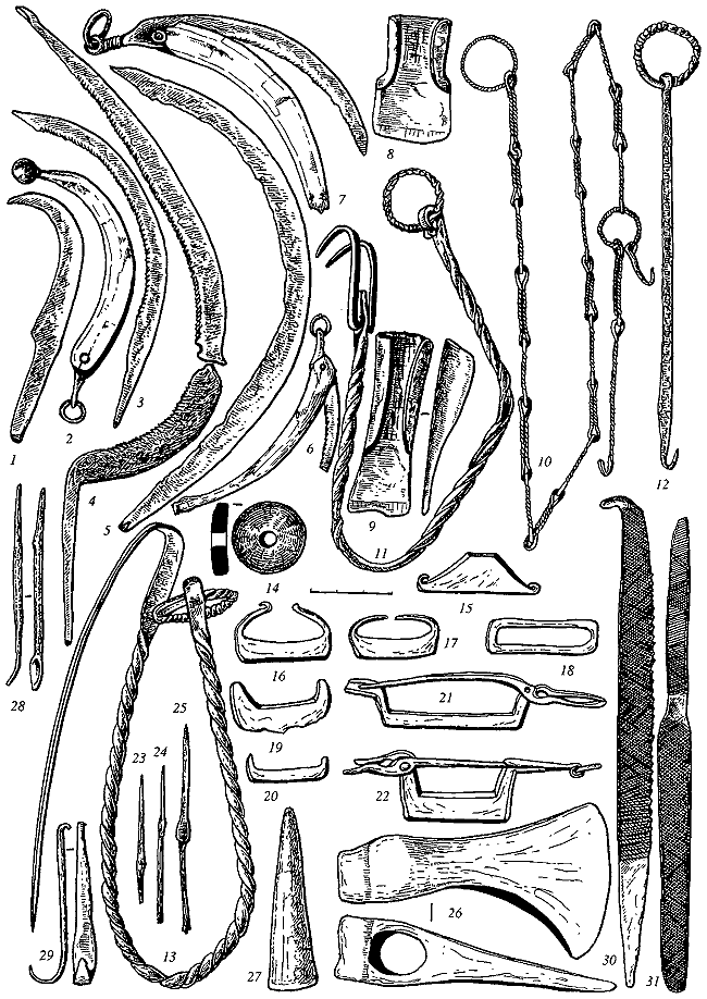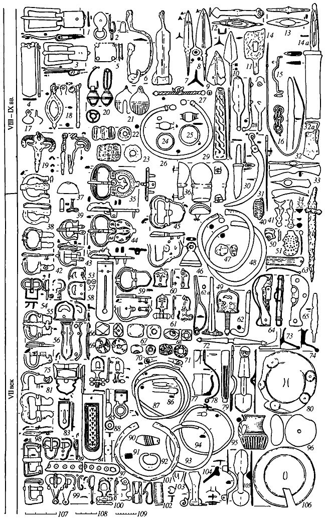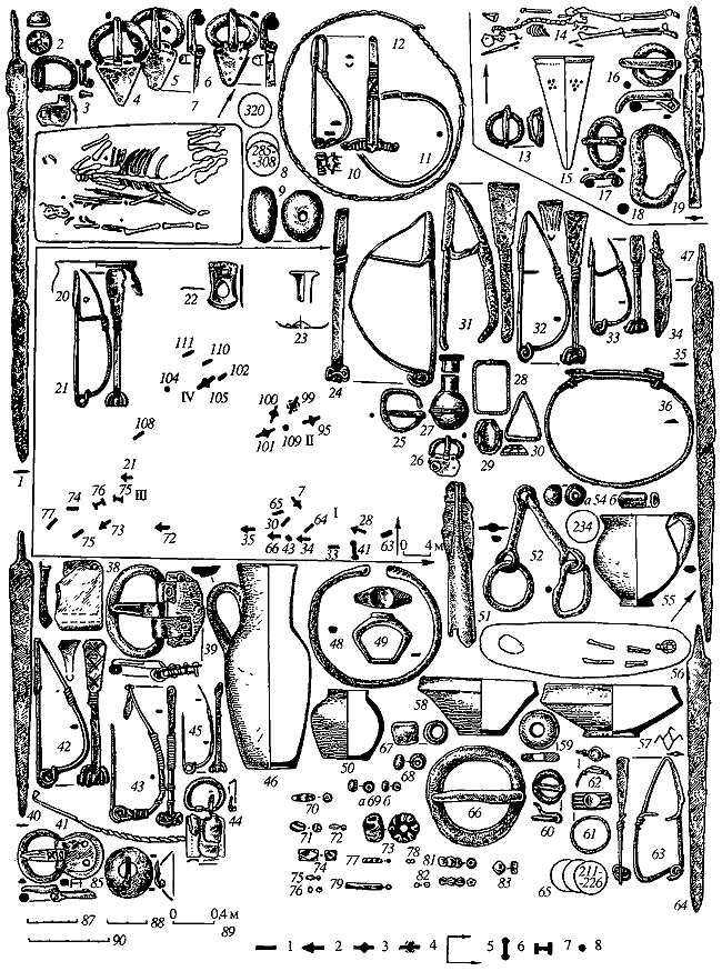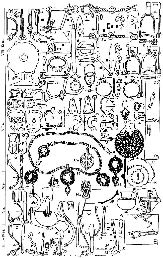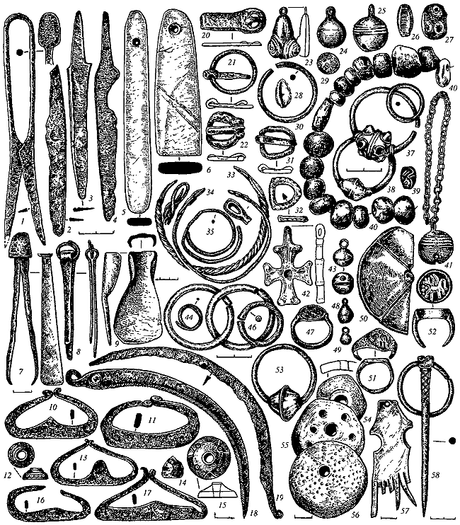 1 – ножницы; 2–4 – ножи; 5, 6 – оселки; 7, 8 – пинцеты; 9 – мотыжка; 10, 11, 13, 16, 17 – кресала; 12, 15 – пуговицы-пронизи; 14 – кремешок; 18, 19 – складные серпы; 20–22, 31, 32 – пряжки; 23–25, 41, 43 – бубенчики; 26, 27–29, 39, 40 – бусы; 30, 35, 37, 38, 45, 46, 53 – височные кольца; 33, 34 – браслеты; 36, 44 – кольца для подвешивания; 42 – крест; 47, 51, 52 – перстни; 48, 49 – пуговки; 50 – зеркало; 54–56 – пряслица; 57 – гребешок; 58 – булавка.