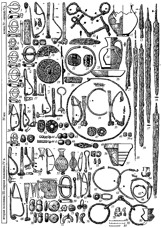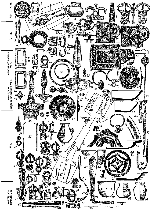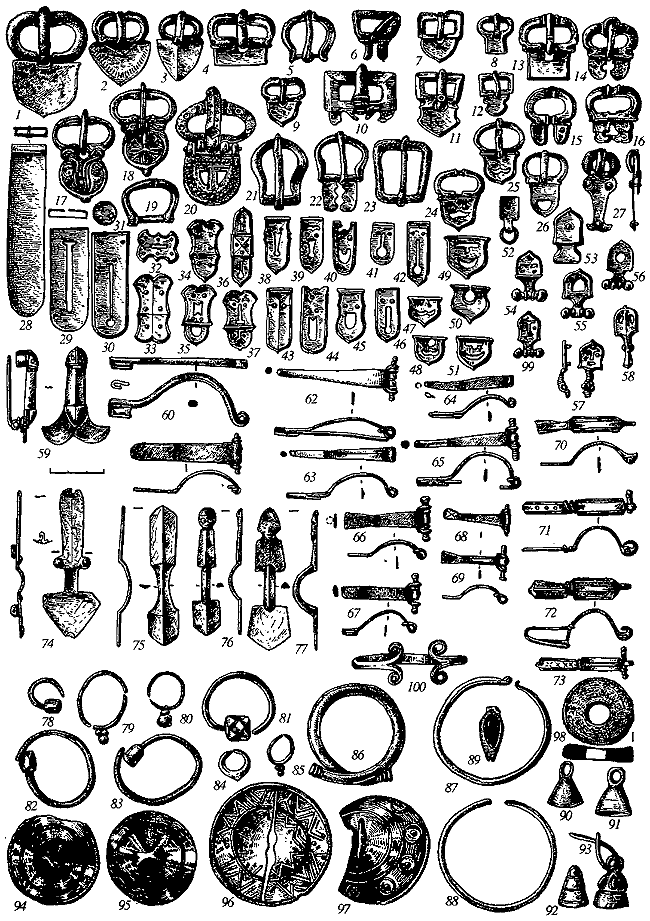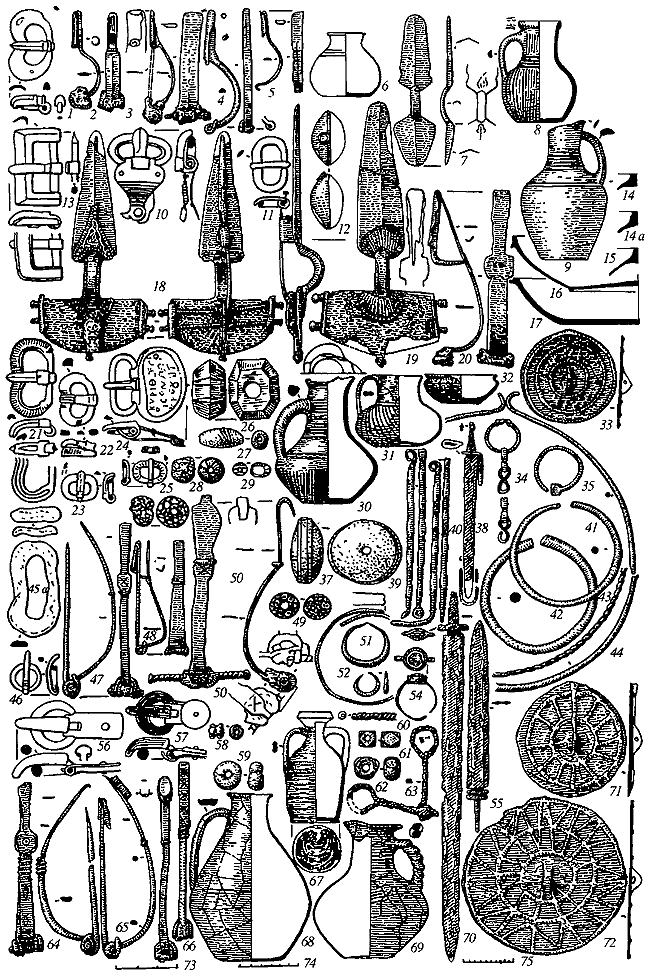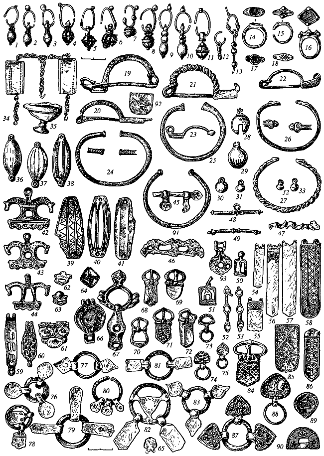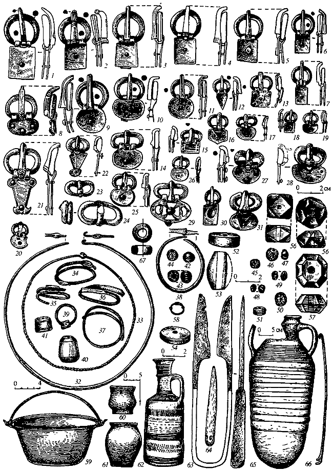 1 – ножницы; 2–4 – ножи; 5, 6 – оселки; 7, 8 – пинцеты; 9 – мотыжка; 10, 11, 13, 16, 17 – кресала; 12, 15 – пуговицы-пронизи; 14 – кремешок; 18, 19 – складные серпы; 20–22, 31, 32 – пряжки; 23–25, 41, 43 – бубенчики; 26, 27–29, 39, 40 – бусы; 30, 35, 37, 38, 45, 46, 53 – височные кольца; 33, 34 – браслеты; 36, 44 – кольца для подвешивания; 42 – крест; 47, 51, 52 – перстни; 48, 49 – пуговки; 50 – зеркало; 54–56 – пряслица; 57 – гребешок; 58 – булавка.